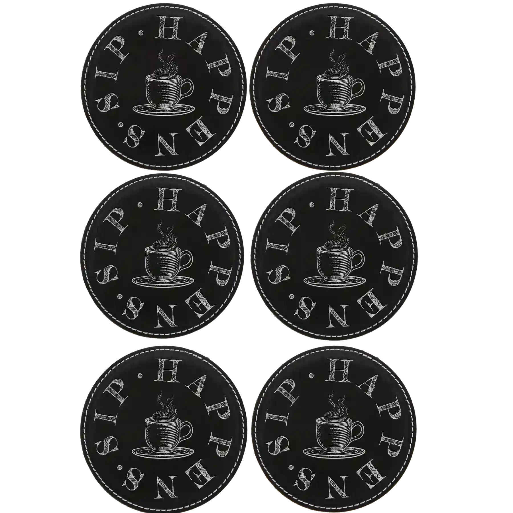 Personalized Coffee Sip Happens Round Leatherette Coasters Set of 6 - Black Silver